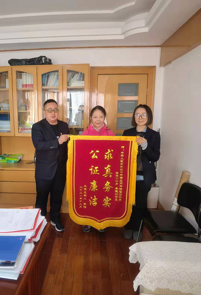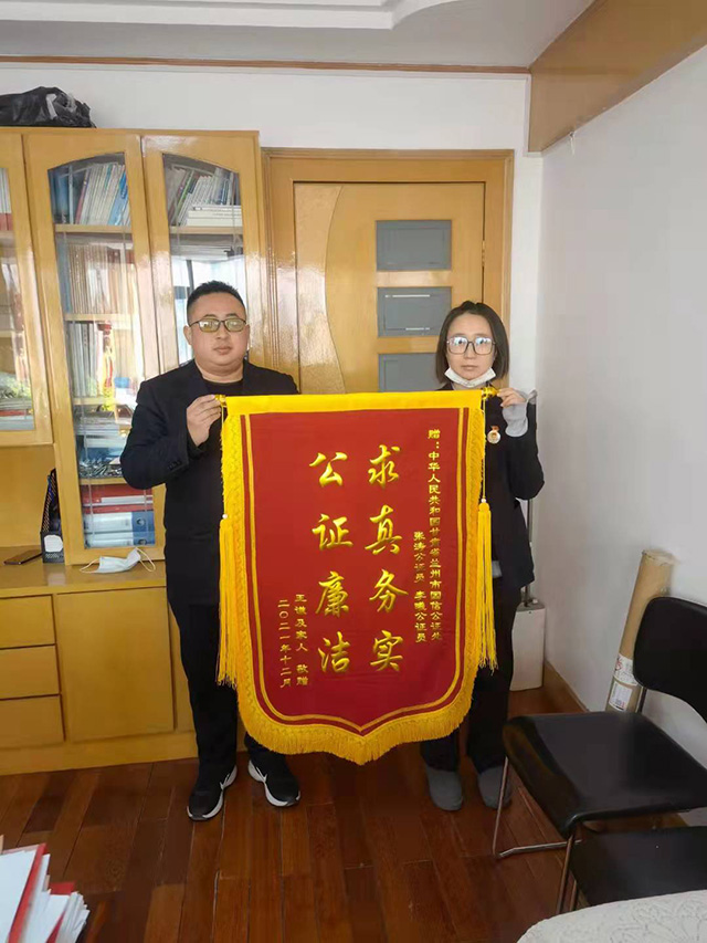 0931-8418450今天姓王的當事人來到國信,對國信公證人員在這次歷史遺留房產(chǎn)問題辦理公證過程中主動上門,加班加點,不壓其煩,解決了她們家里的大難題,還以公益為目的,以百姓為中心,針對她們家里的困難情況,減免了部分公證費。她的感激之情無以言表,自己主動送一副旌旗,連著說你們國信的公證人員太好了。